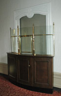 On the west side, near the organ -- which, between performances, rests on a platform inside protective folding doors -- there are other Albee touches. The theatre's filigree cast-iron railing was the base for the design that covers the baffles on the Wurlitzer organ.